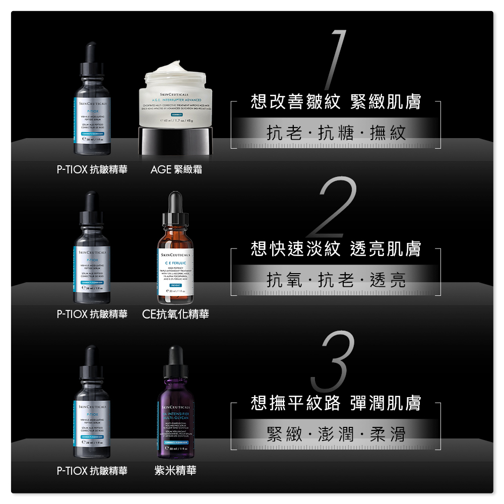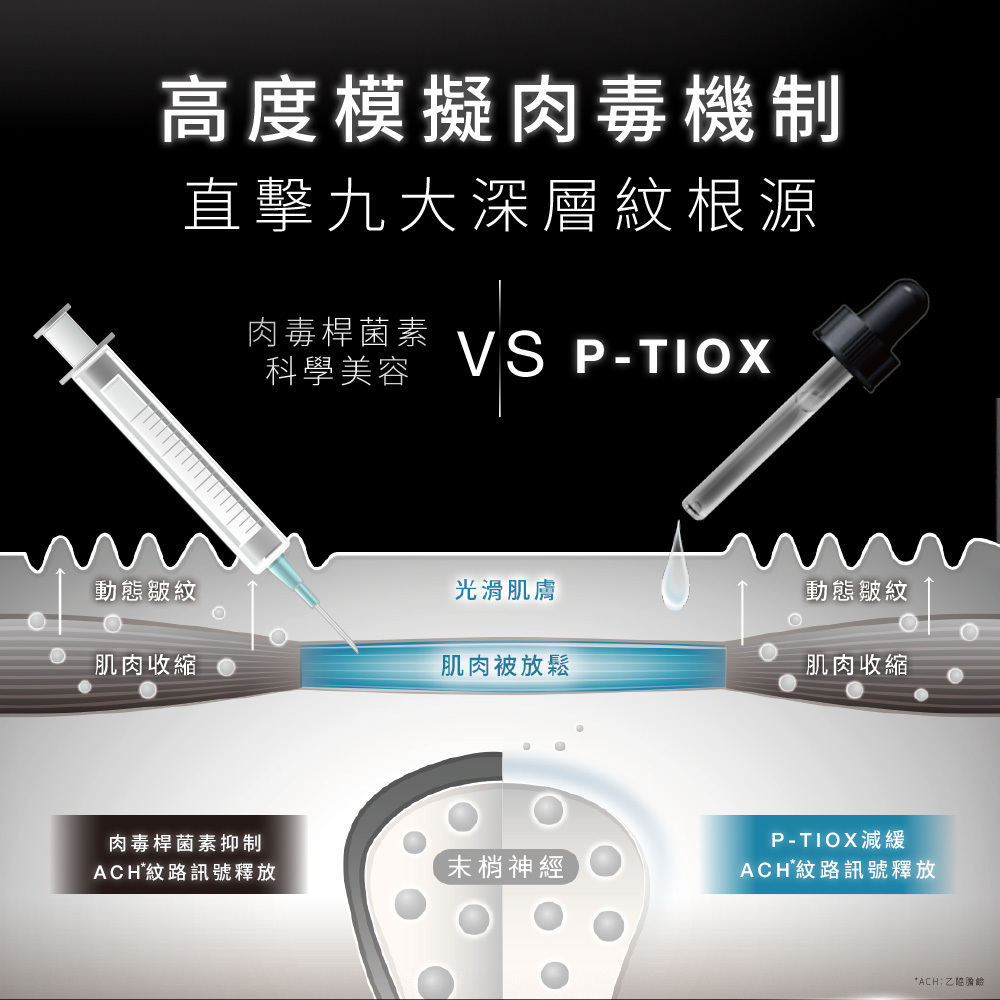 面部表情是通過肌肉的持續拉扯而產生,表情紋通常出現於眼周、前額、臉頰及唇周等的,久而久之便會形成明顯可見的皺紋及細紋。P-TIOX 超胜肽抗皺極光精華,研發新一代先進胜肽配方,對抗深層紋,調節神經傳導物質及肌肉收縮因子,臨床實驗證實有效淡化九大深層紋路,一週實現煥亮肌。