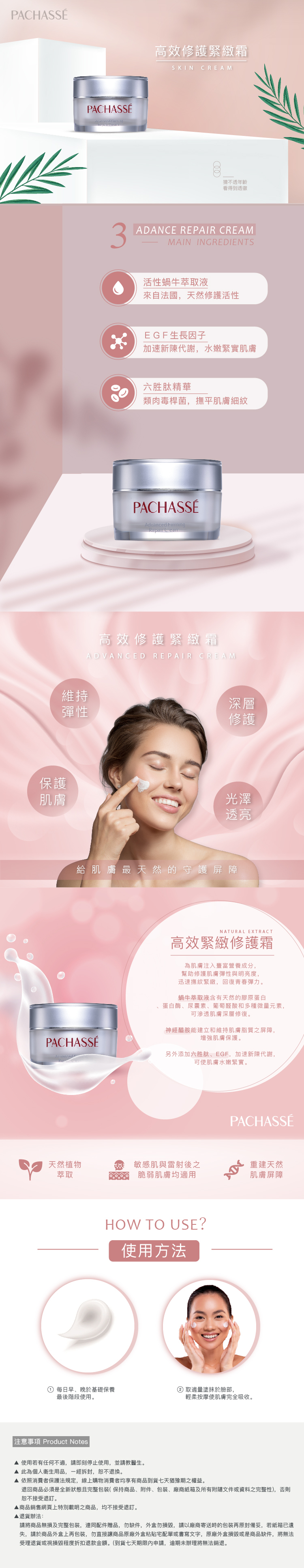 為肌膚注入豐富營養成分,幫助修護肌膚彈性與明亮度迅速撫紋緊緻,回復青春彈力。