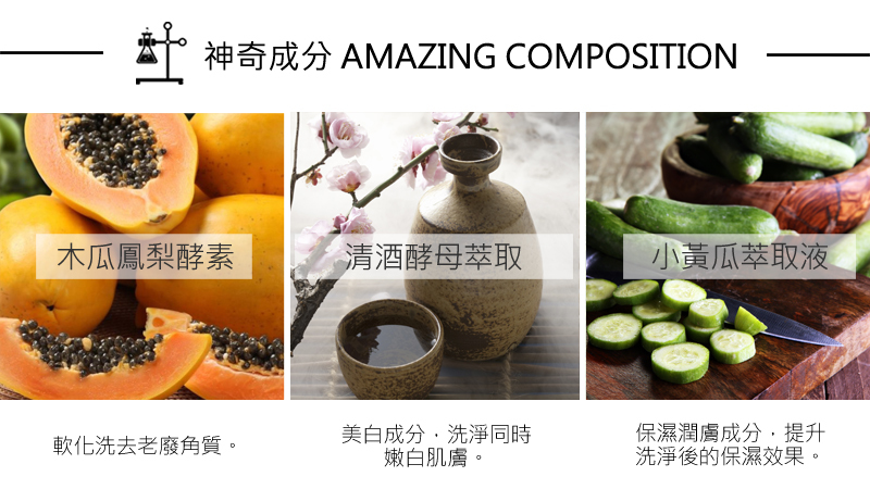 清酒酵母及水果酵素能溫和軟化角質及促進肌膚更新。