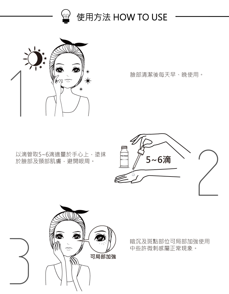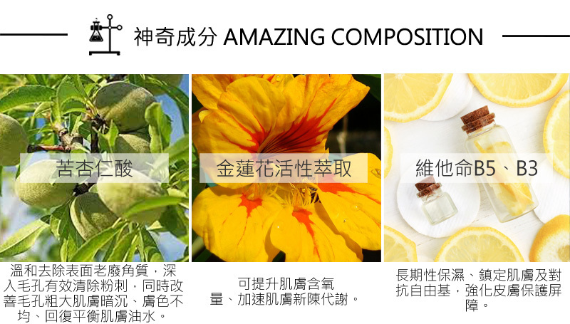 持續散發動人光彩改善蠟黃黯沈、粗、細紋與孔大的老化問題.使肌膚白皙滑.膚色呈現均勻光采採用德國高純度苦杏酸5.運用杏酸的卓越親膚果.和去除表老廢角質.深入毛孔有效清除粉刺時改肌膚沈、色不均等問題;添加金蓮花活性萃取.加速肌膚新陳代謝。維他B5長期性保濕、鎮定肌膚.維他命B3可改毛孔粗大、平衡油脂強化皮膚保護屏障。蜂蜜保濕因子,鎖水時保濕.賦肌膚長效滋潤。天天使用溫煥膚.可使肌膚嫩白細緻