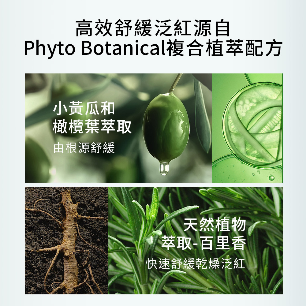 ◆富含天然植物萃取-百里香、橄欖葉和小黃瓜萃取,一小時*-46%改善乾紅,強化肌膚修護力