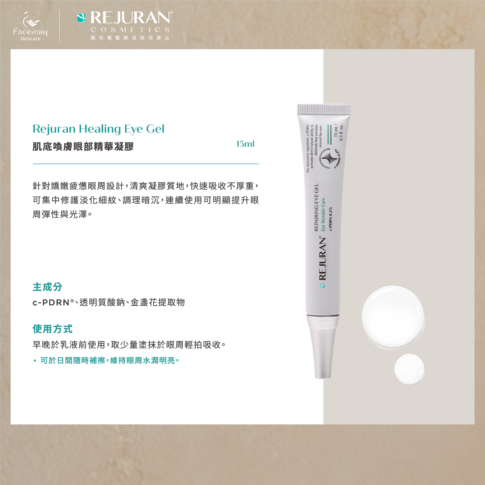 清爽凝膠質地,快速吸收不厚重,長效保濕無負擔,可集中修護淡化細紋、提升眼周肌膚彈性,溫和守護眼周細緻敏感的肌膚,連續使用可明顯提升眼周彈性與光澤。
