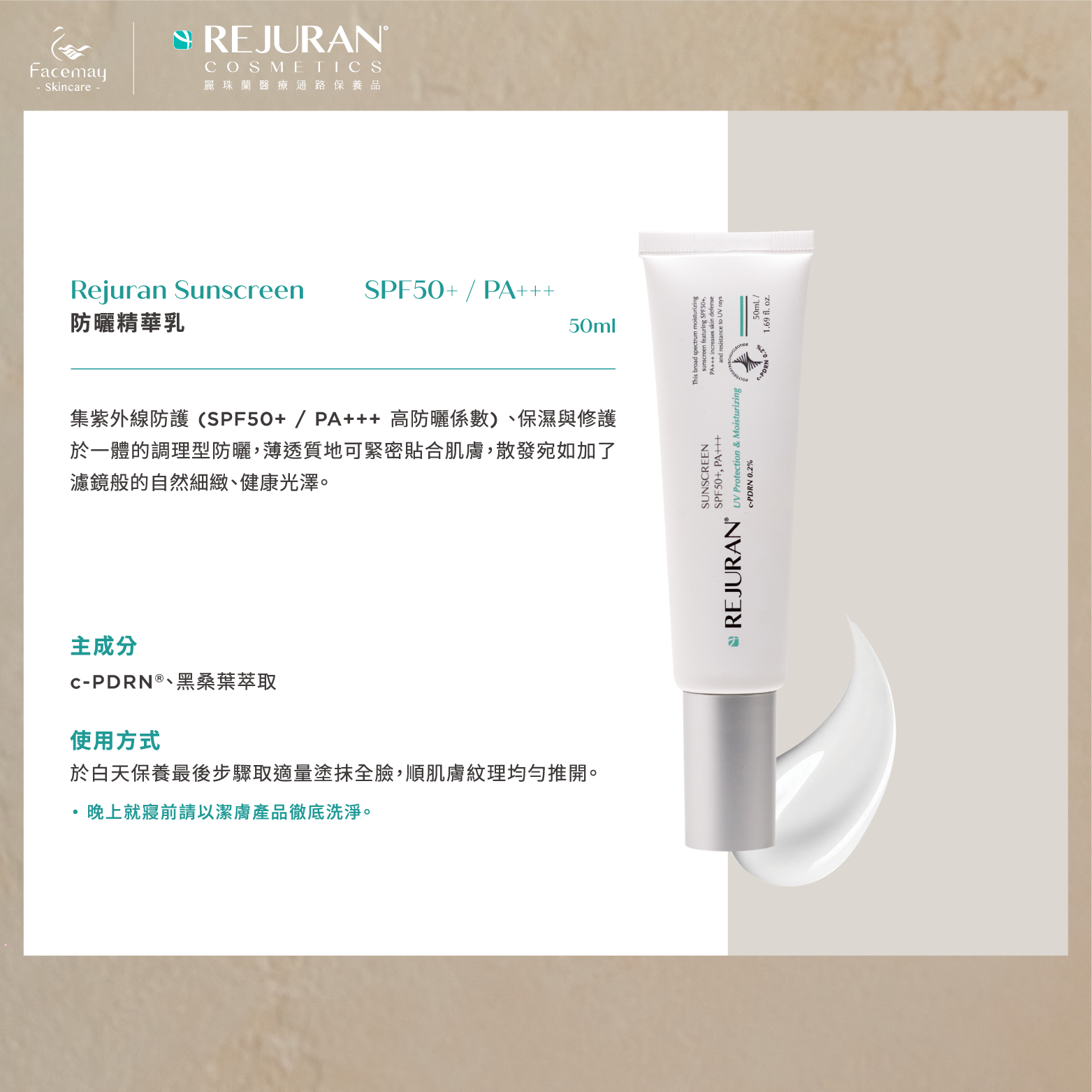 集紫外線防護(SPF50+ / PA+++ 高防曬係數)、保濕與修護於一體,天然植物