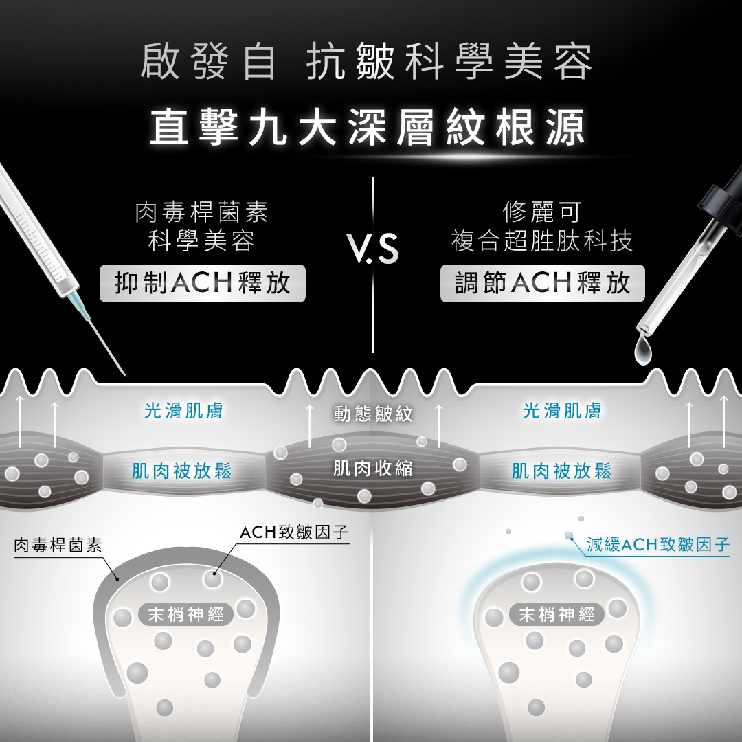 ◆乙醯六肽-8+三胜肽-成分模仿天然蛇毒胜肽的作用機制,抑制引起肌肉收縮之致皺因子